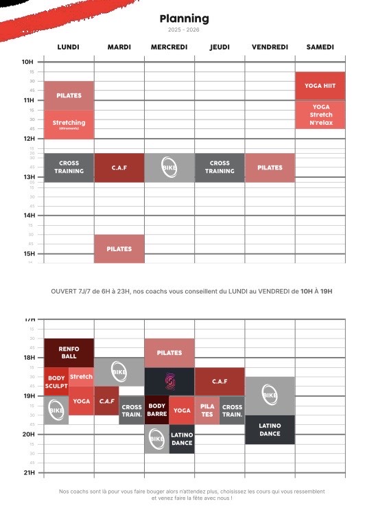 Notre club est ouvert de 6h à 23h 7J/7, week-end et jours fériés compris.