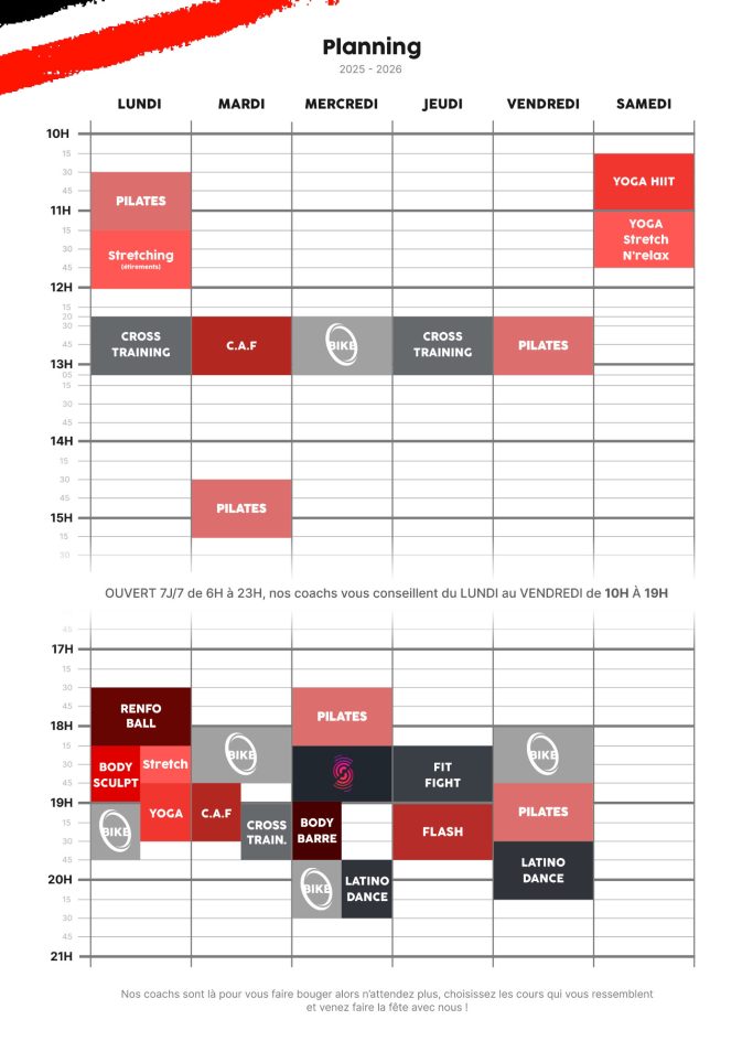 Notre club est ouvert de 6h à 23h 7J/7, week-end et jours fériés compris.